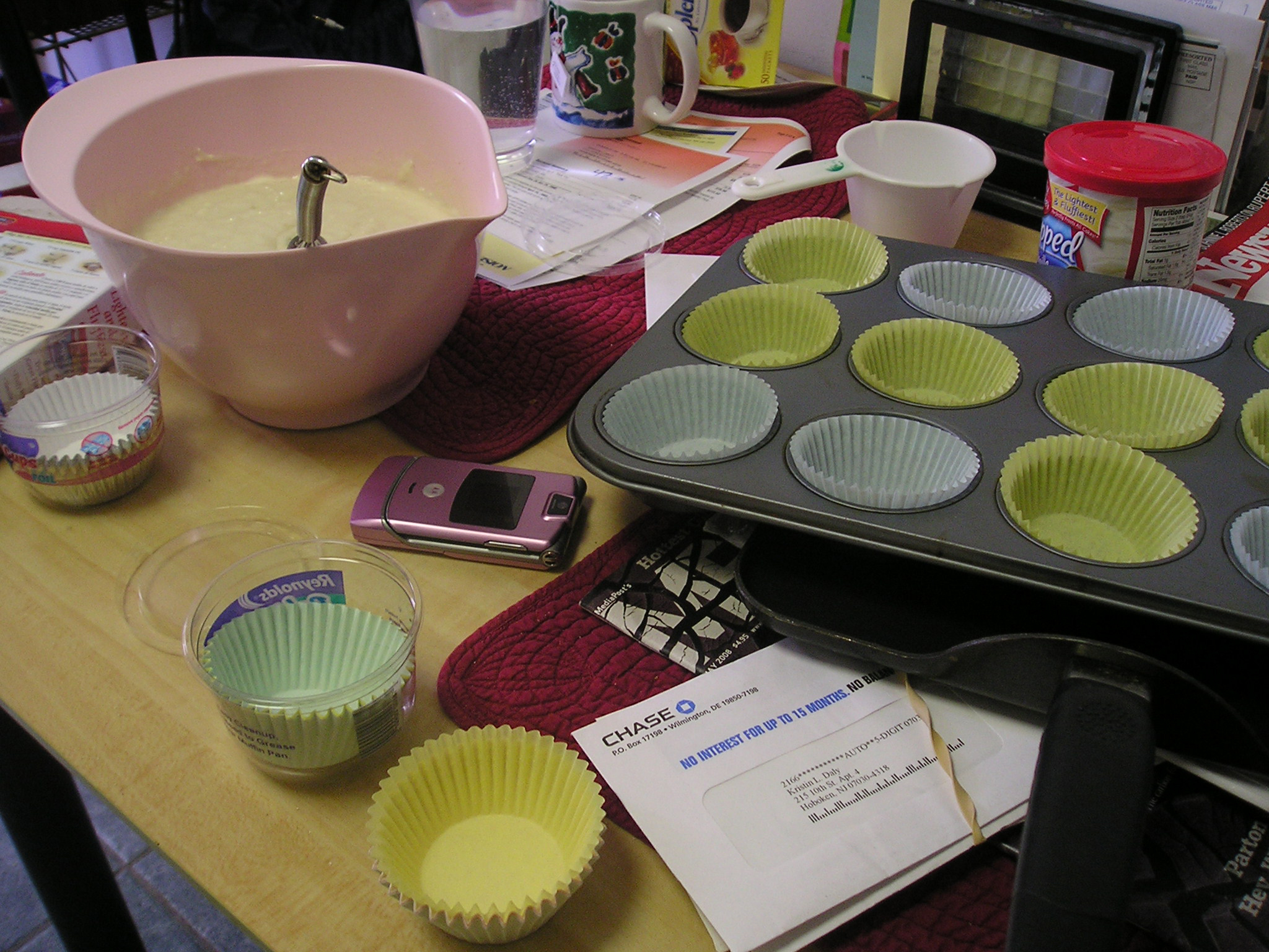 on our dining table/mail table/bill organizer. Who says you need a fancy island in your kitchen like Martha Stewart to make good lookin’ food?? A little crowded, but it works. As long as my cell phone doesn’t land in the batter, I’m good to go. I’m learning to improvise for what I don’t have: