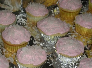 Duncan Hines supposedly makes a coconut cake mix, but it is rumored to be hard to find. A&P sure didn’t have it. I had to improvise. A week short of my paycheck, cupcakes from scratch weren’t going to happen. I ended up using a vanilla cake and icing but threw in a lot of shredded coconut. I almost bought coconut extract, but for a tiny bottle priced at $5.00, even Ms. Ball O’Sunshine reassured me, as a fellow Splenda stealer, “Screw that!” She gets it.