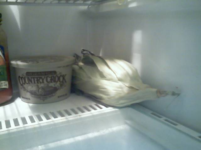 I’ve seen this corn husk hiding in the dim corner above the crisper since the first day I moved in. You know what? I bet what’s waiting is so wonderful that I’ll leave that surprise to it’s owner. The thought of peeling back that husk is just too frightening. But the Country Crock next to it has met its dooms day—expired: Sept. 24, 2006. OOOH that’s the oldest one so far! What else, what else! Four reduced fat mayos, all expired, mostly 2007. One skipped out on Dec 2006. American cheese slices, expired: May 12, 2007. Pre-sliced, canned black olives, I’m not sure, but the cloudy juice alone didn’t really resemble the normal consistency or color of brine. He’s a goner. TOSS!