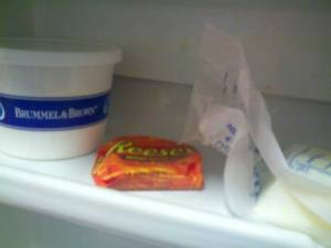 And last, but not least, phantom roommate’s food shelf. It’s only down to a few items now. After I realized that I didn’t want food that was still OK to waste on her shelf, I started to eat it. I have consumed the following from her shelf: Canned chicken, crunchy peanut butter, America’s Choice red fish (generic Swedish Fish) and….hmmm. I think that’s it for now. DISCLAIMER: all of these foods were still within their safe expiration date when I consumed them. Also–I am not a mooch. I just hate wasting food. I also ate her perogies in the freezer. I’m sorry.