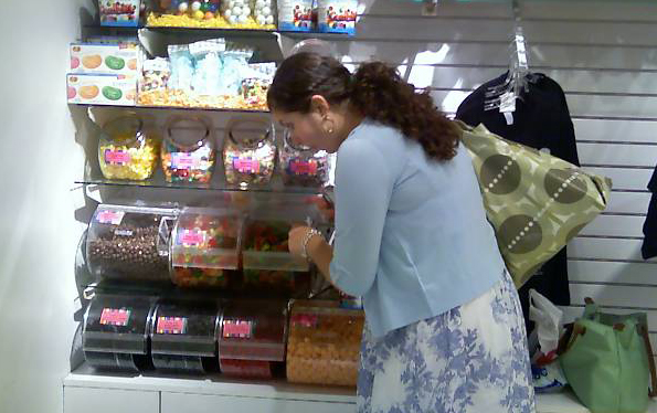 I immediately flag down a salesperson and ask where the sugar-free candy is. She is speechless for about 30 seconds, looking around the space with wide eyes. “Wow, honestly, we don’t usually get that request,” she said. She had to go ask a manager. They lead us to a teeny, tiny back corner and tell us to enjoy the treats. We look at each other and decide, we are going to take that as an open invitation to chow down. How can you bust the sugar challenged?? I quickly grab a sugar-free gummy worm and drop it into my mouth. Twin takes about five orange gummy things and loads two in her mouth. We start to act like five year olds, popping other gummies in our pockets and mouths before another salesgirl comes over to us asking if we need any help. Busted! Luckily, we were the only two sad sugar-free customers in the store, so they totally took pity on us and just left us alone.
