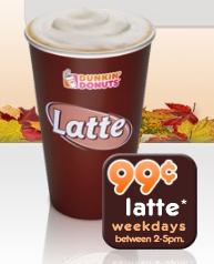 Those of us who dig through our pockets to use every cent accounted for will be happy to hear about Dunkin Donuts’ promotion that lets us buy a small hot or iced latte on any weekday between 2 p.m. and 5 p.m. for 99 cents through Nov. 11. You can also get a 99 cent Egg and Cheese Sandwich with the purchase of a medium or larger hot coffee through Nov. 1.