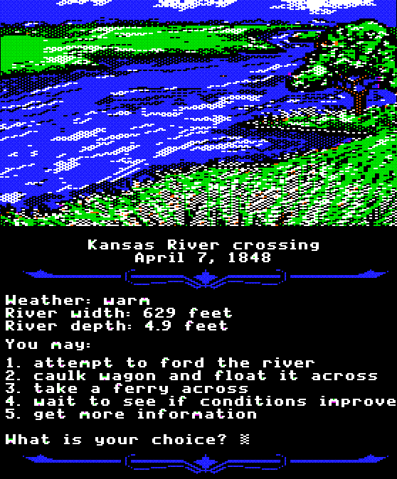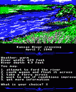Despite all that business, personally, I loved when it came time to cross a river. There were a few options as to how to move forward, dependant upon how much cargo was in your wagon and the depth of the water. Though a risk, I always chose to ford the river with my oxen, despite what my situation was in my wagon. In my haste, I usually lost half my cargo, and my patience with the game.