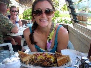 Maria, about to dig into her Hawaiian omelet while on vacay in Maui. She notes that instead of maple syrup on the table, they had coconut syrup!