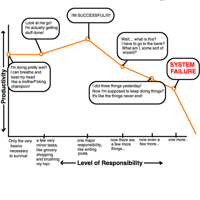 Instead of getting down on myself for not feeling like a responsible adult, it’s better to focus on what you can control–not surpassing your capacity for responsibility. If taking out the garbage when it stinks is too much, then light some candles and take it out tomorrow.